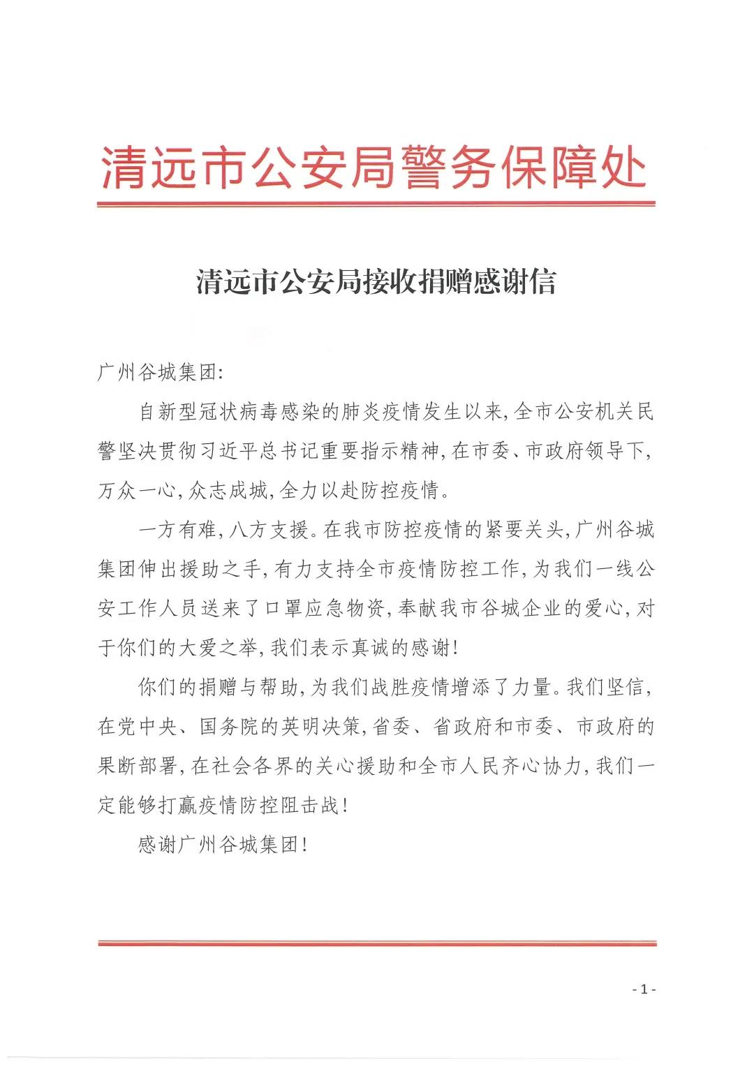 一方有難,八方支援,在清遠(yuǎn)市防控疫情的緊要關(guān)頭,谷城礦業(yè)伸出援助之手,有力支持全市疫情防控工作,為清遠(yuǎn)市一線公安工作人員捐贈(zèng)10000只口罩應(yīng)急物資,用于支持清遠(yuǎn)市新冠肺炎疫情防控工作。市公安局警務(wù)保障處劉少媚接收,并專門發(fā)來感謝信,表示感謝。