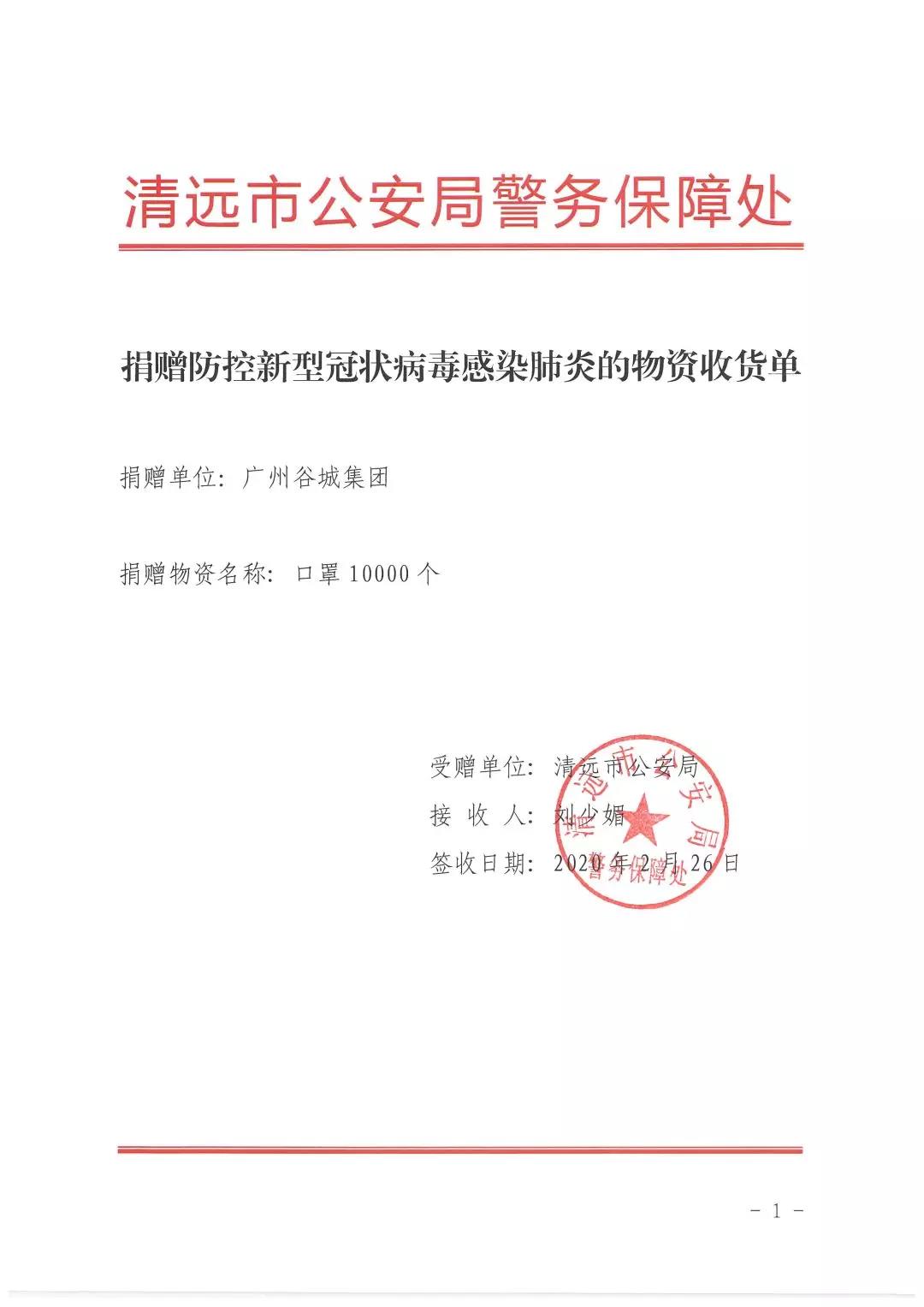谷城集團(tuán)副總裁、谷城礦業(yè)總經(jīng)理賴志長(zhǎng)和董事會(huì)監(jiān)事鄧廣宏向清遠(yuǎn)市公安局捐贈(zèng)10000只口罩,市公安局警務(wù)保障處劉少媚接收,并表示感謝。
