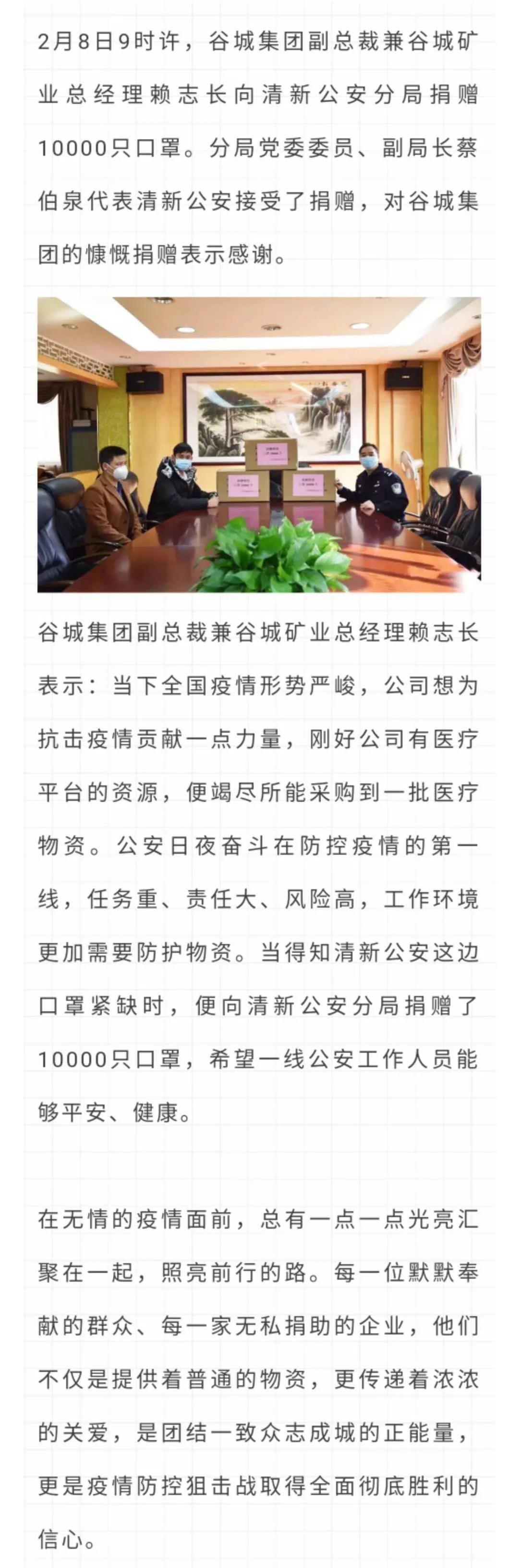 為堅決打贏疫情防控阻擊戰,清新公安全警動員,全力以赴投入疫情防控工作中,每天24小時輪班執勤,守護全區人民群眾。疫情無情,人間有情。在清新公安奮戰在抗擊疫情一線時,谷城集團副總裁兼谷城礦業總經理賴志長表示:“支持防疫,企業責無旁貸。”