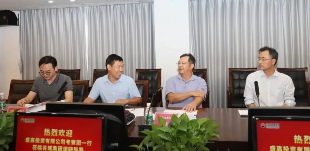 2020年8月26日,盛高投資有限公司總裁駱蔚峰、副總裁樓信逵,盛高投資有限公司產融園區事業中心產融投資部總經理李斌、王俗儉,副總監吳樂平一行蒞臨谷城集團調研。