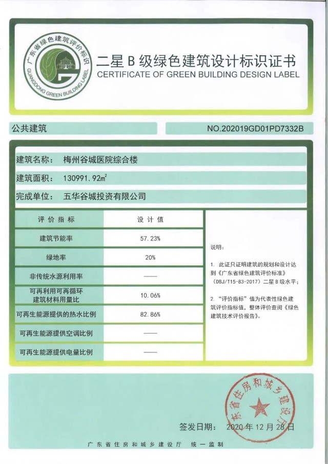 近日,谷城集團——梅州谷城醫(yī)院項目順利獲得廣東省住建廳頒發(fā)的“二星B級綠色建筑設(shè)計標(biāo)識證書”。