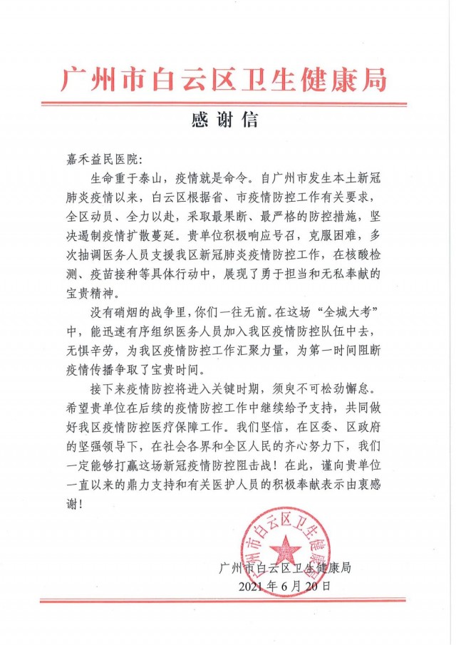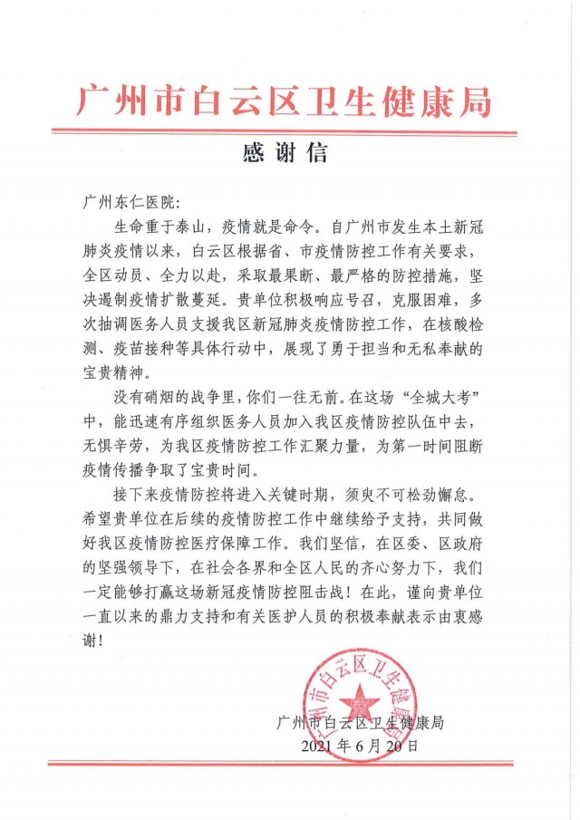 6月20日,白云區衛健委給谷仁醫療發來感謝信,肯定了谷仁醫療抗疫工作。