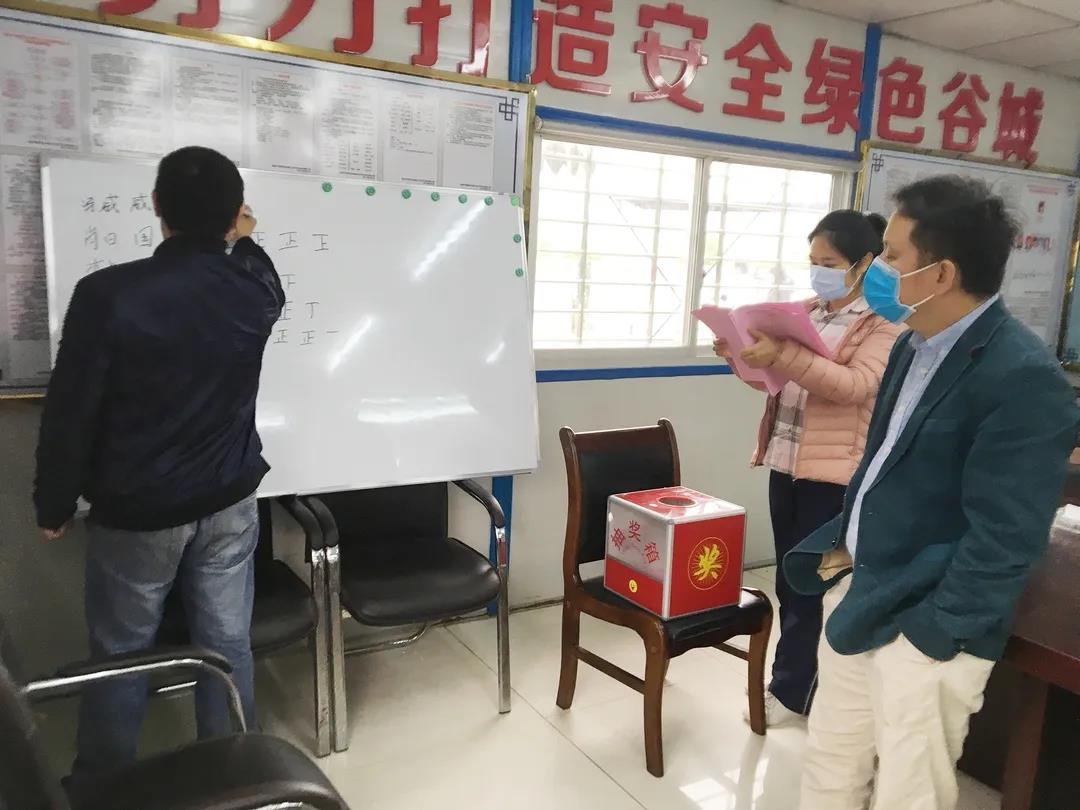 監票員魏玉華和計票員焦毅、何杜能清點票數現場