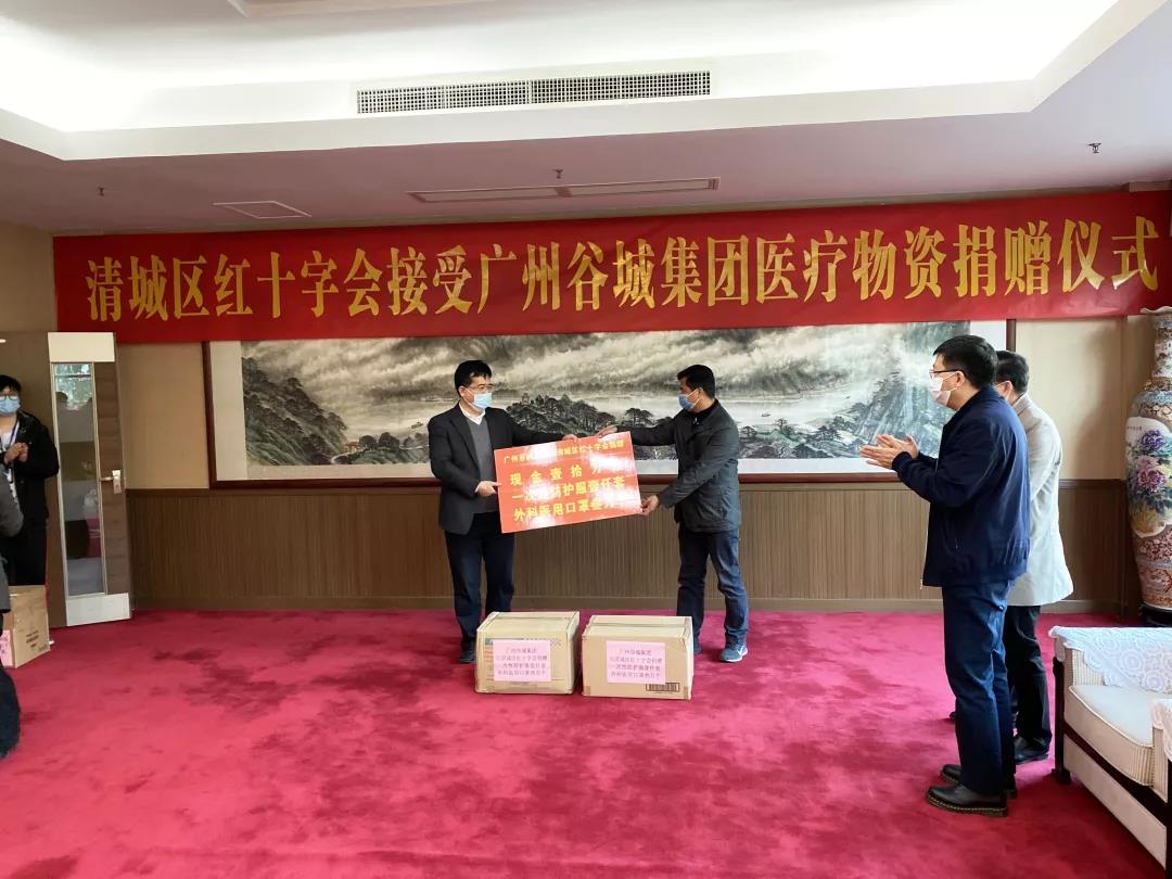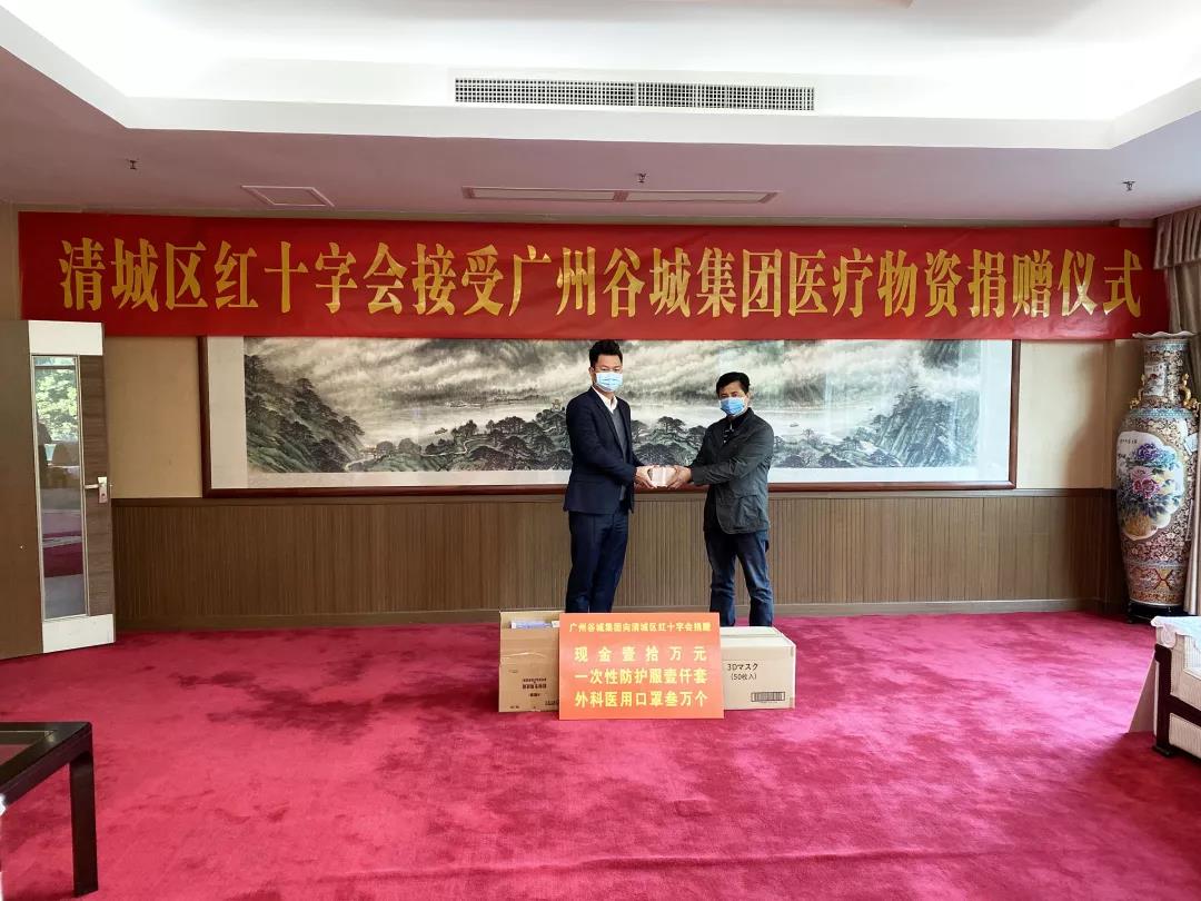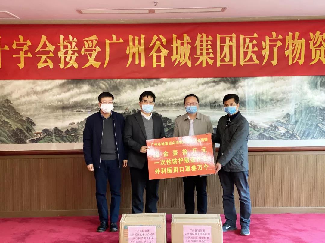 1月31日,廣州谷城集團向清遠市清城區紅十字會捐贈現金10萬、一次性防護服1000套、防疫口罩30000個,專門用于新型冠狀病毒肺炎防治工作。谷城集團董事總裁肖大志、董事副總裁賴志興、清遠市清城區委副書記、區長邱澤軍、清城區副區長、區紅十字會會長袁志武、區衛健局等的單位領導參加了捐贈儀式。