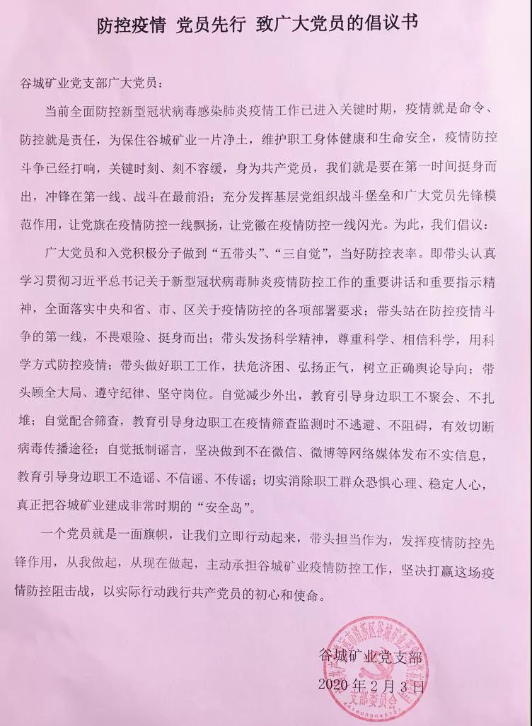 疫情發生后,谷城礦業黨支部認真學習和貫徹習近平總書記關于新型冠狀病毒肺炎疫情防控工作的重要講話和重要指示精神,全面落實中央和省、市、區、鎮關于疫情防控的各項部署要求,積極做好疫情防范工作。以黨支部為帶頭領導作用,以入黨積極分子為一線先鋒崗,及時成立疫情防控工作領導小組,法人代表賴遠林親任組長,總經理賴志長(入黨積極分子)和場長王景衛(黨員)任副組長,全面負責疫情防控工作。